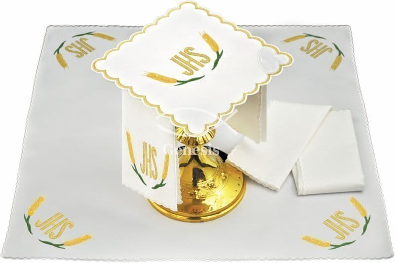Bielizna kielichowa wykonana z wysokiej jakości tkaniny, zdobiona haftem z motywem eucharystycznym.