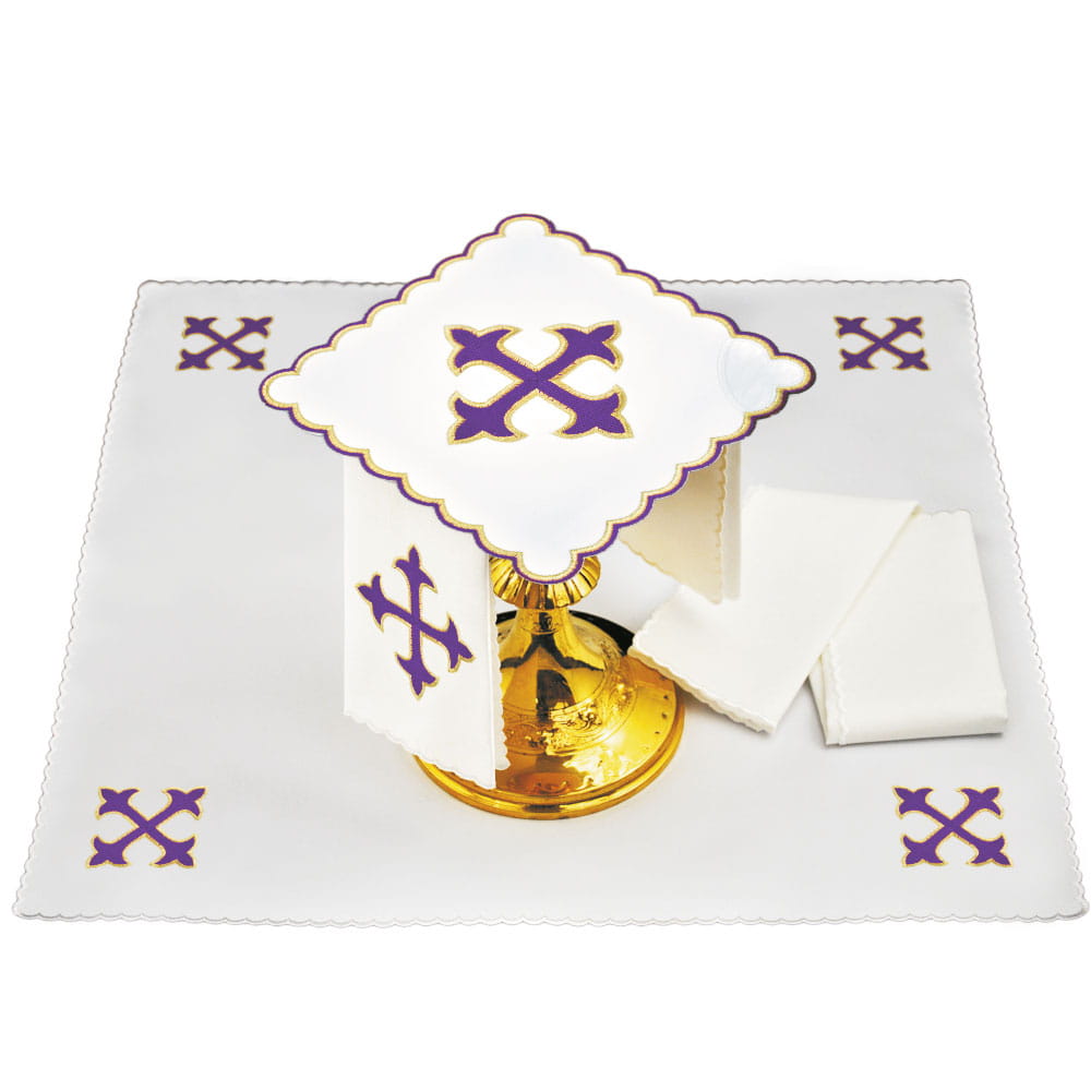 Bielizna kielichowa wykonana z wysokiej jakości tkaniny, zdobiona haftem z motywem eucharystycznym.