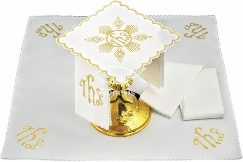 Bielizna kielichowa wykonana z wysokiej jakości tkaniny, zdobiona haftem z motywem eucharystycznym.
