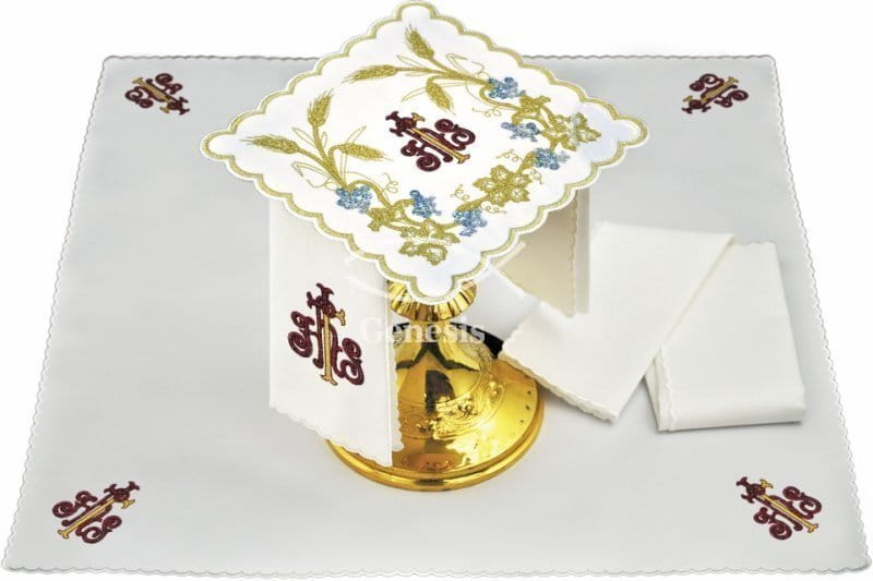 Bielizna kielichowa wykonana z wysokiej jakości tkaniny, zdobiona haftem z motywem eucharystycznym.
