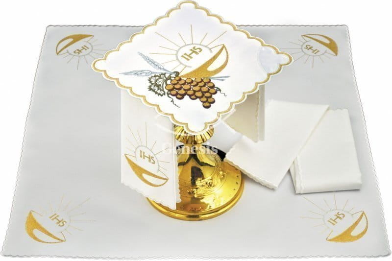 Bielizna kielichowa wykonana z wysokiej jakości tkaniny, zdobiona haftem z motywem eucharystycznym.