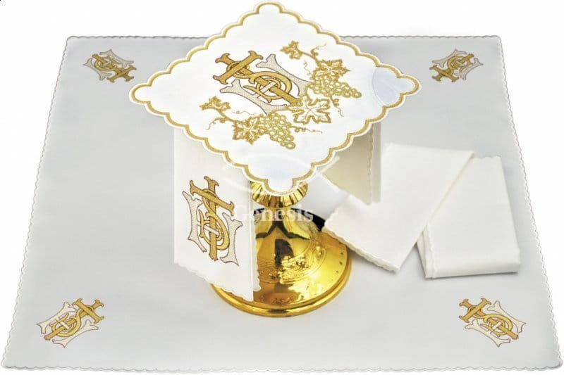 Bielizna kielichowa wykonana z wysokiej jakości tkaniny, zdobiona haftem z motywem eucharystycznym.