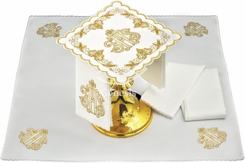 Bielizna kielichowa wykonana z wysokiej jakości tkaniny, zdobiona haftem z motywem eucharystycznym.
