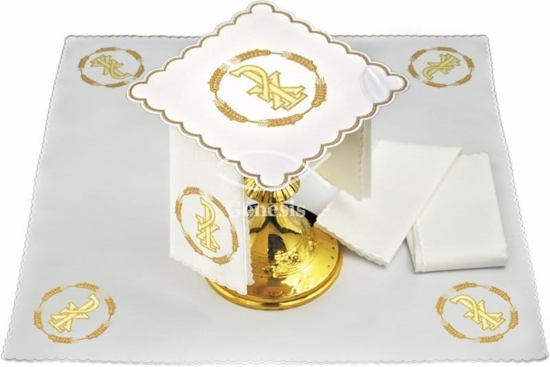 Bielizna kielichowa wykonana z wysokiej jakości tkaniny, zdobiona haftem z motywem eucharystycznym.