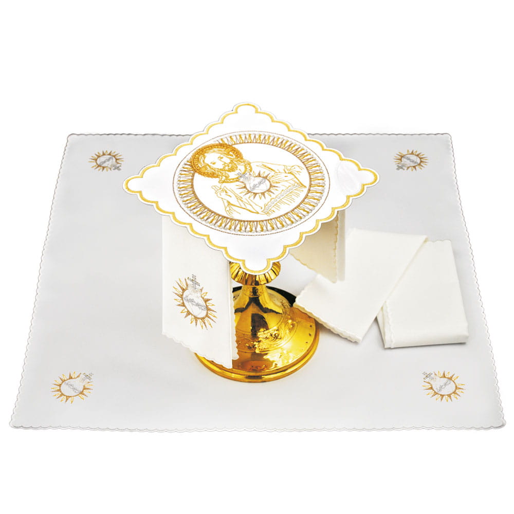 Bielizna kielichowa wykonana z wysokiej jakości tkaniny, zdobiona haftem z motywem eucharystycznym.