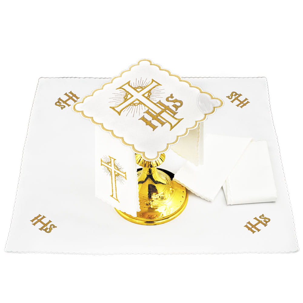 Bielizna kielichowa wykonana z wysokiej jakości tkaniny, zdobiona haftem z motywem eucharystycznym.