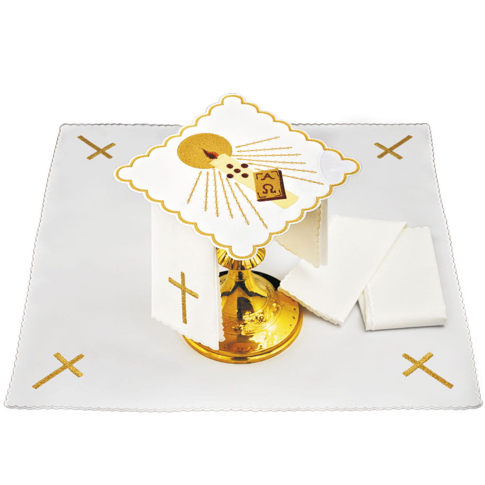 Bielizna kielichowa wykonana z wysokiej jakości tkaniny, zdobiona haftem z motywem eucharystycznym.
