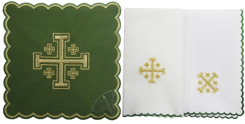 Bielizna kielichowa wykonana z wysokiej jakości tkaniny, zdobiona haftem z motywem eucharystycznym.