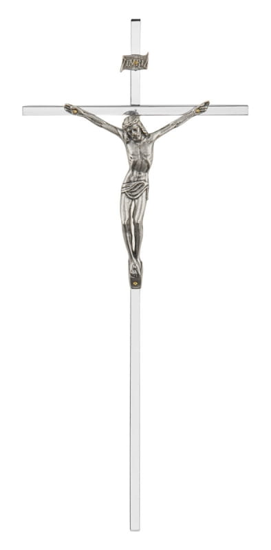 Krzyż mosiężny w kolorze srebrnym.