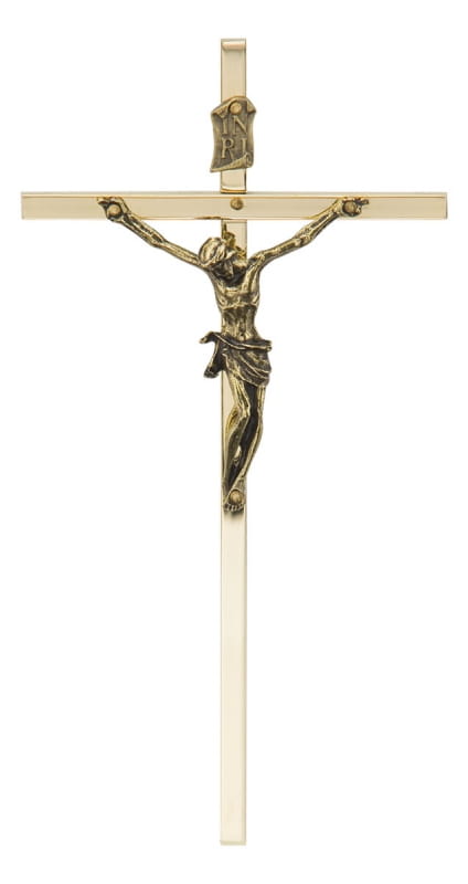 Krzyż wykonany z pręta mosiężnego, wizerunek Chrystusa wykonany ze stopu cynku pokryty powłoką galwaniczną.