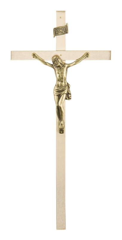 Krzyż wykonany z pręta mosiężnego, wizerunek Chrystusa wykonany ze stopu cynku pokryty powłoką galwaniczną.