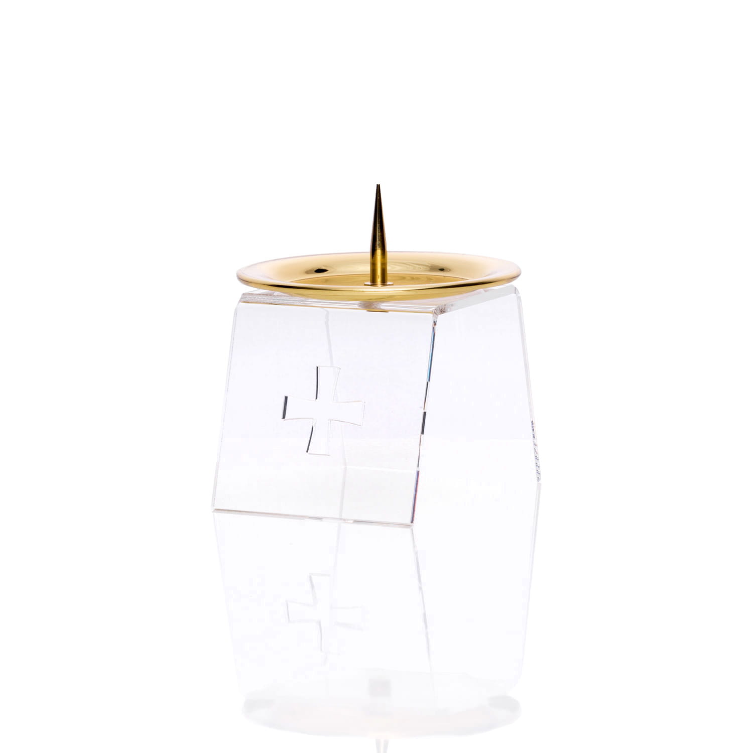 Lichtarz pojedynczy wykonany z pleksi z mosiężnym talerzykiem oraz grotem.