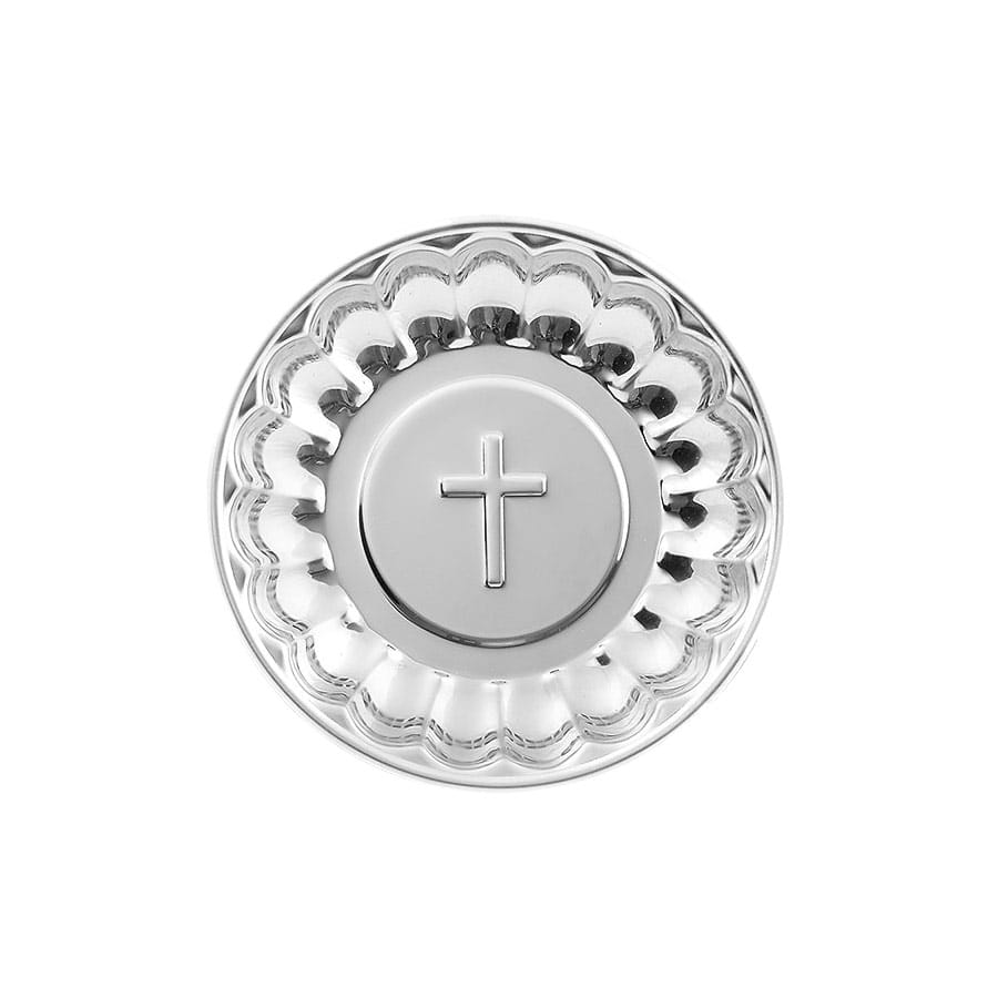 Metalowa miseczka na wodę święconą w kolorze srebrnym.
