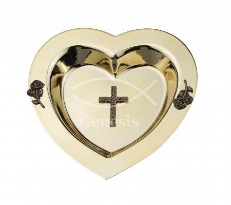 Metalowa miseczka na wodę święconą w kształcie serca w kolorze złotym.