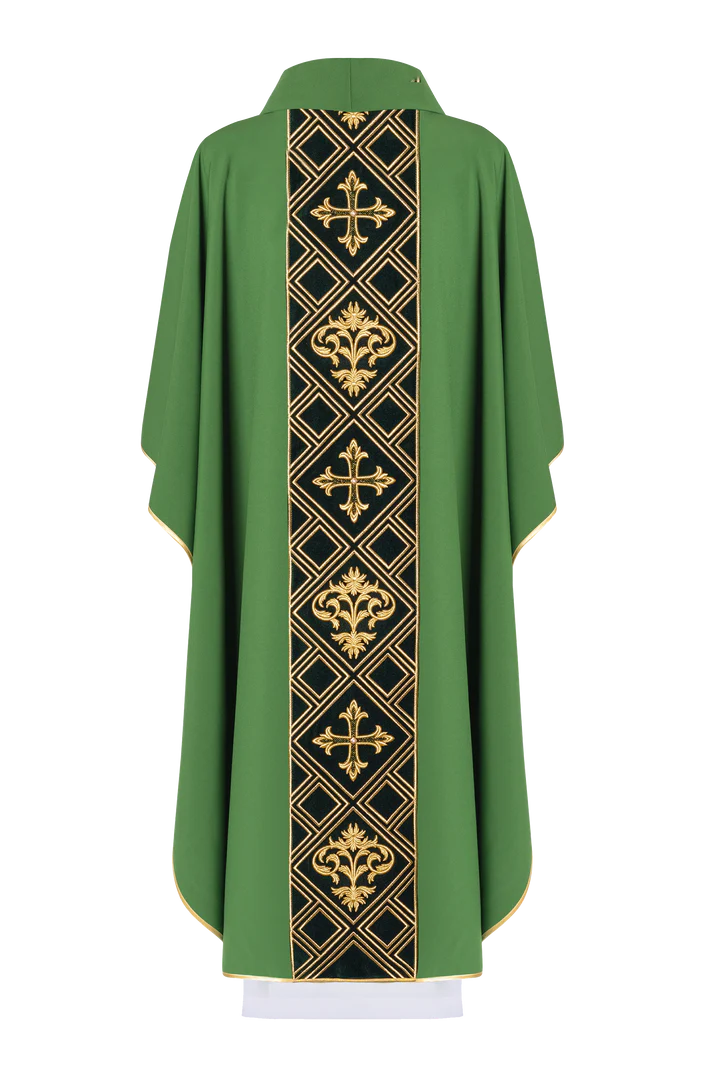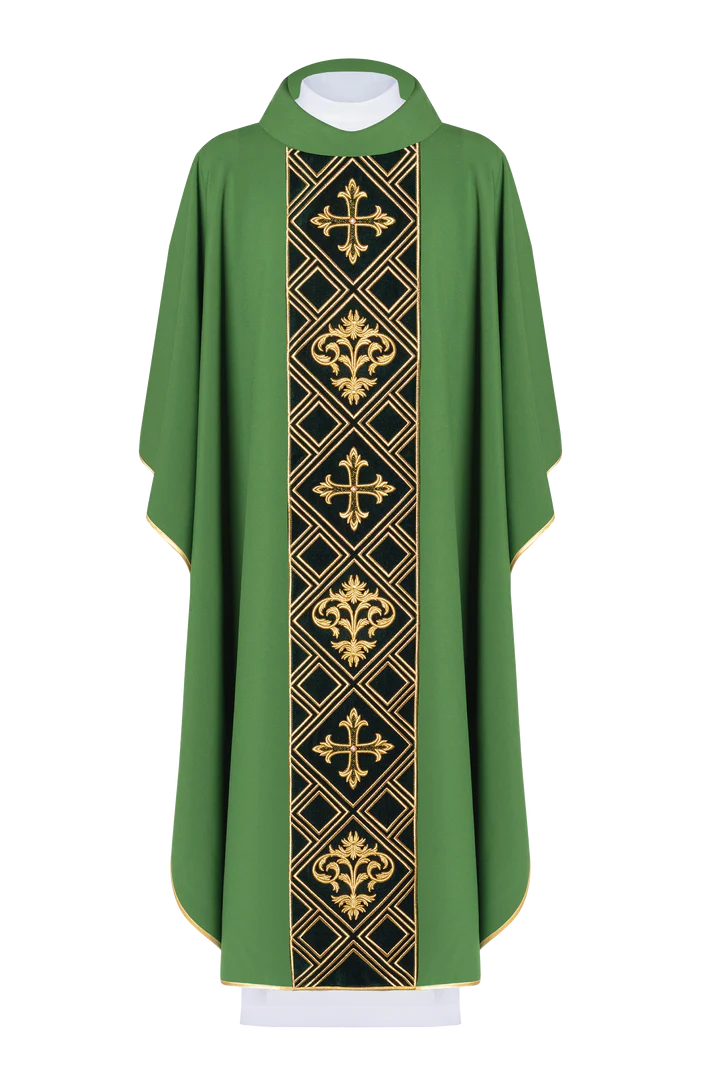 Ornat wykonany z wysokiej jakości tkaniny, zdobionej haftem z symbolami eucharystycznymi,