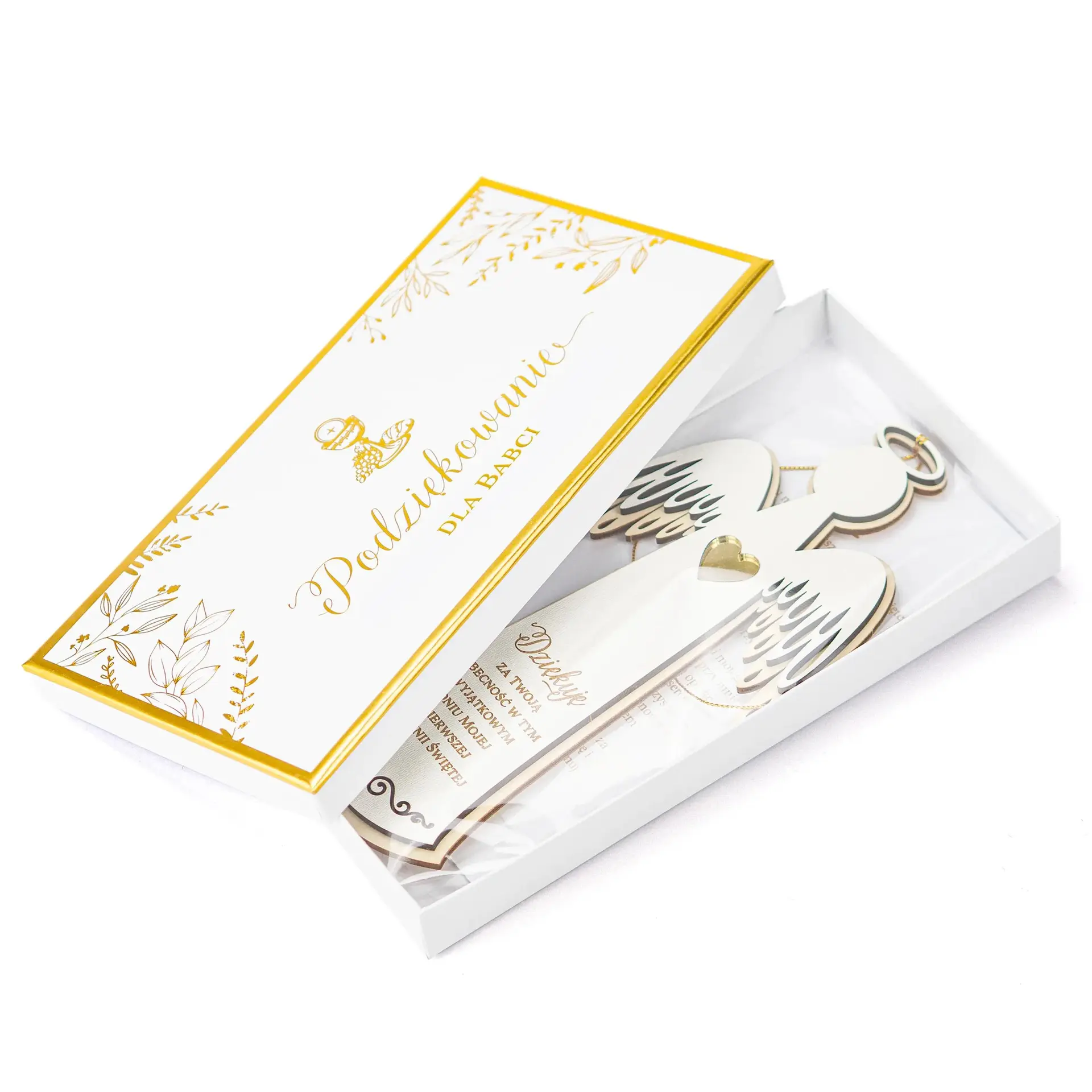 Podziękowanie komunijne w pudełku z drewnianym aniołkiem doskonale wpisuje się w charakter uroczystości i stanowi piękną pamiątkę.