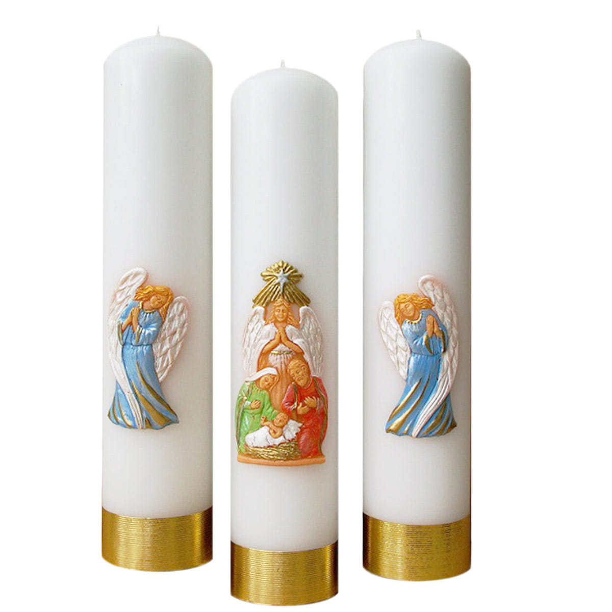 Zestaw trzech świec ołtarzowych bożonarodzeniowych.